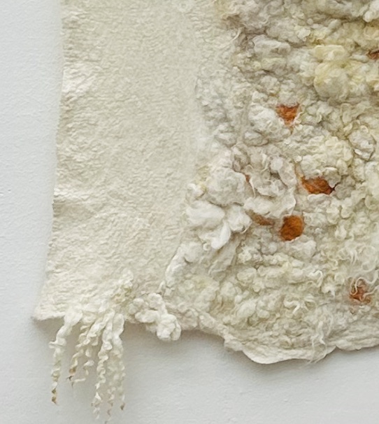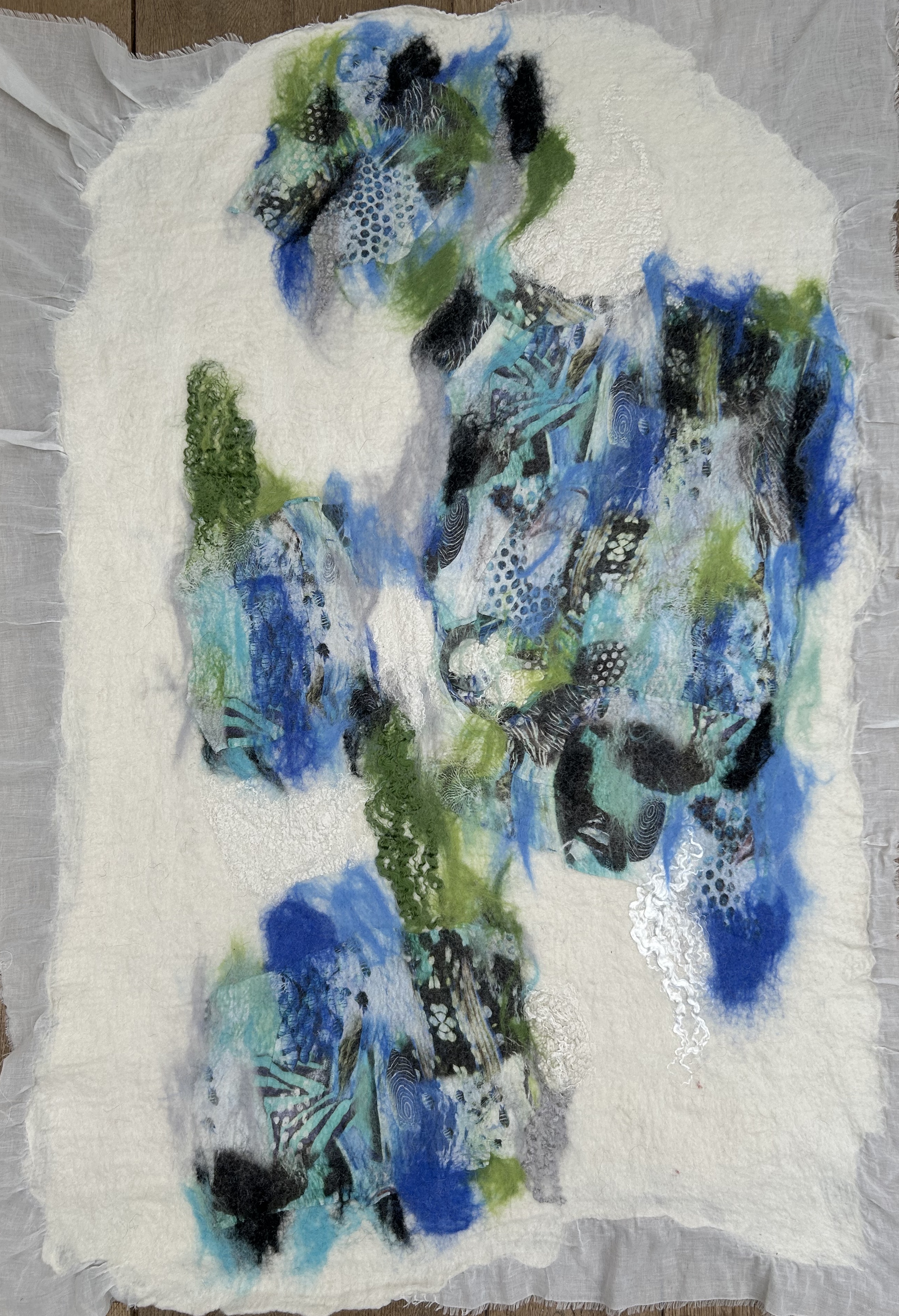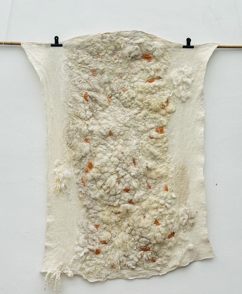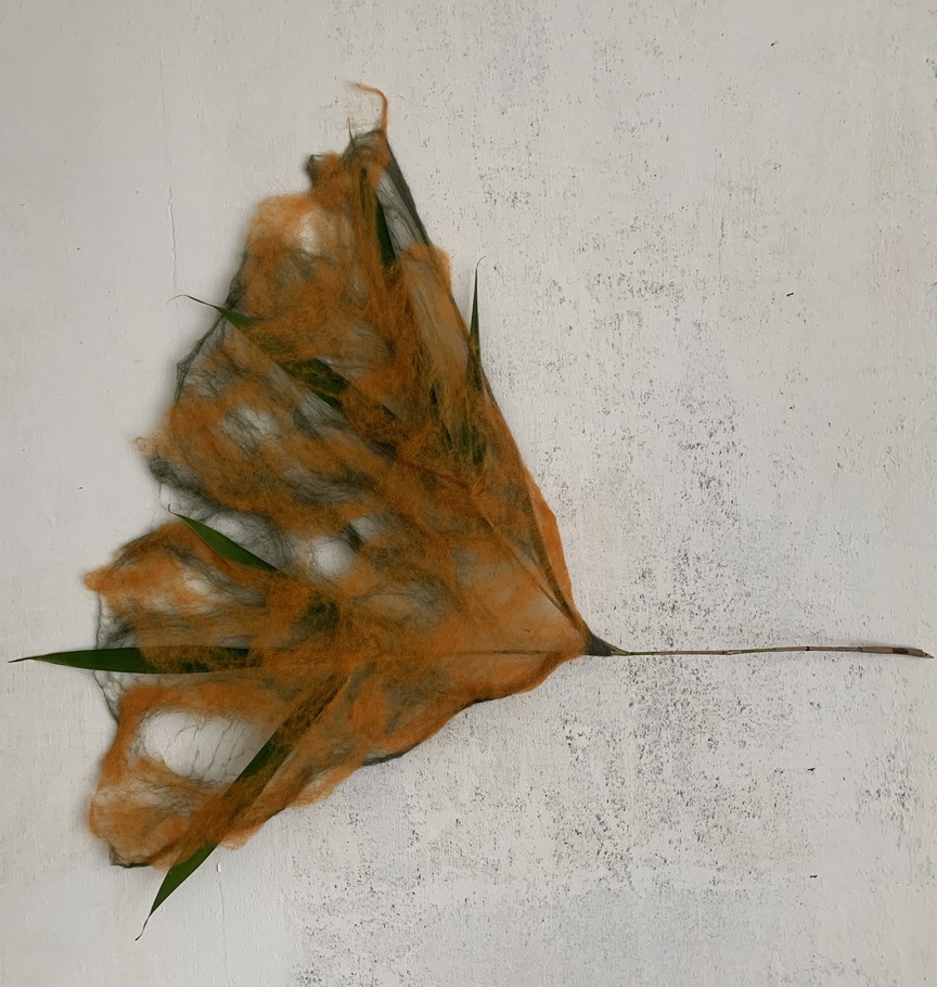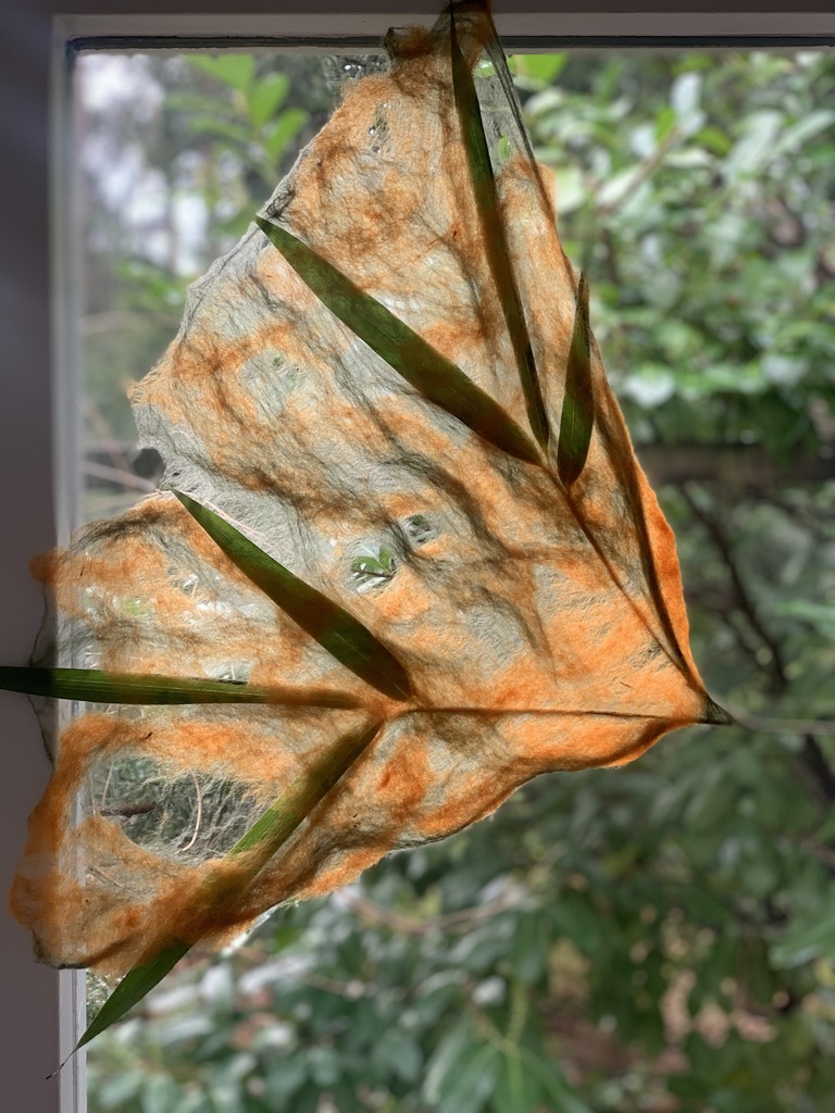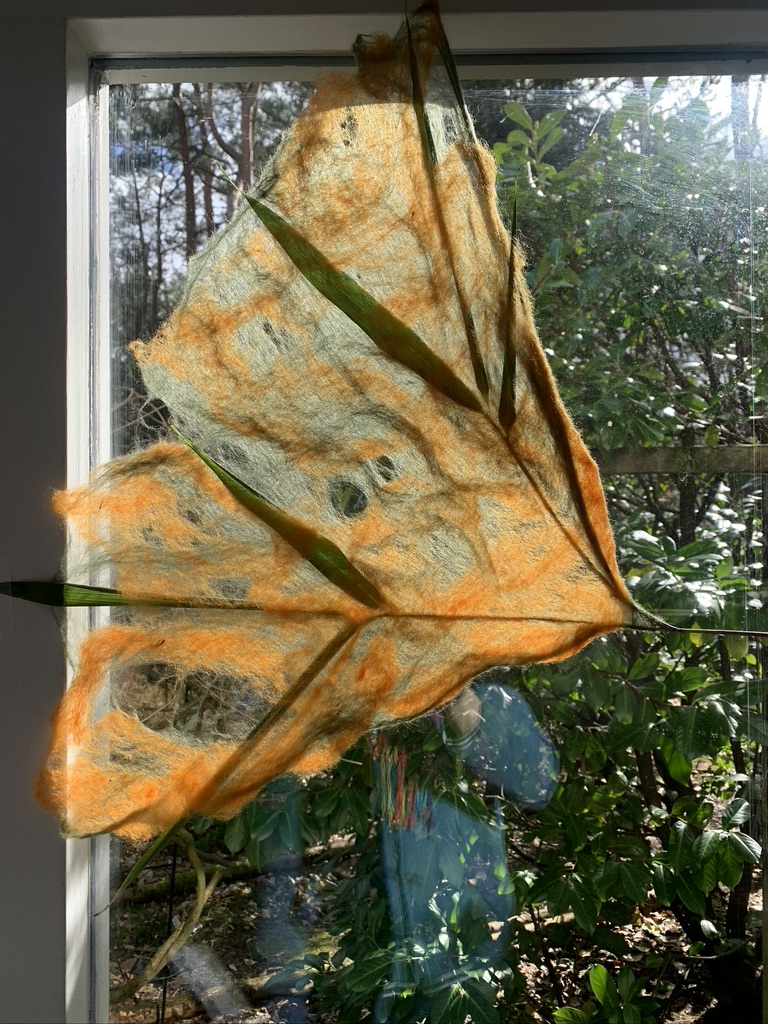 Reed & Paper (90:40 cm) is made of 19 mic Merino wool with reed stems from the woods of the Veluwe where I work. Combined with paper made at the former paper mill De Middelste Molen in Loenen. The bright green color of the reed is still slowly fading away.
