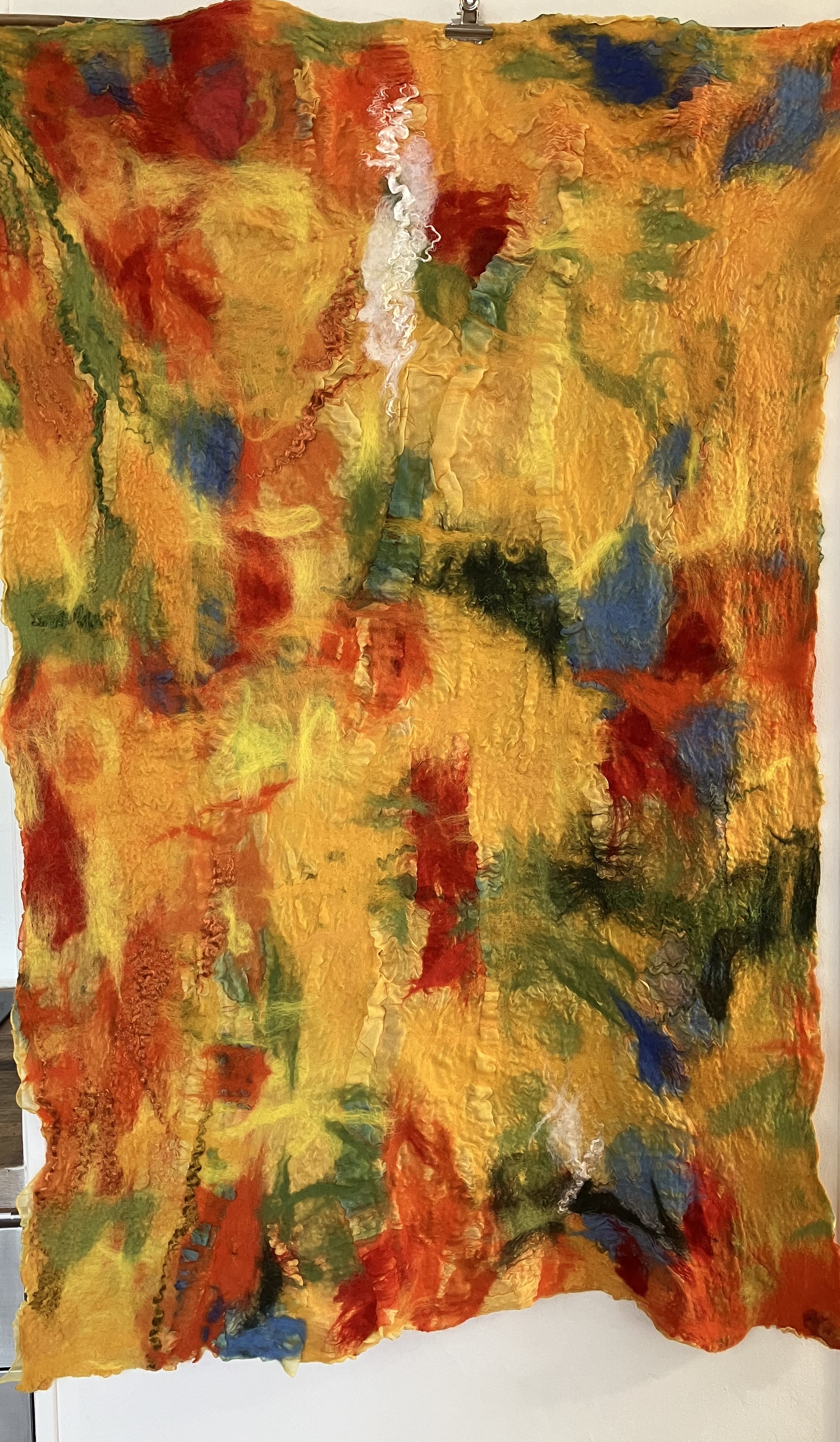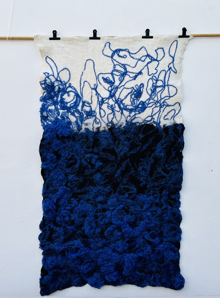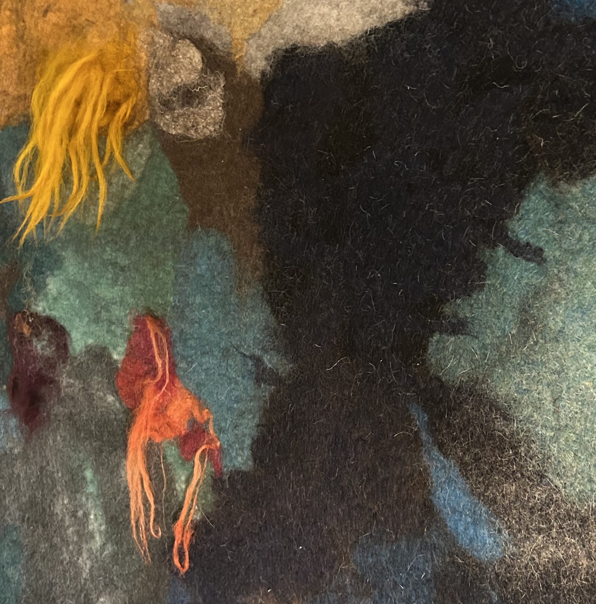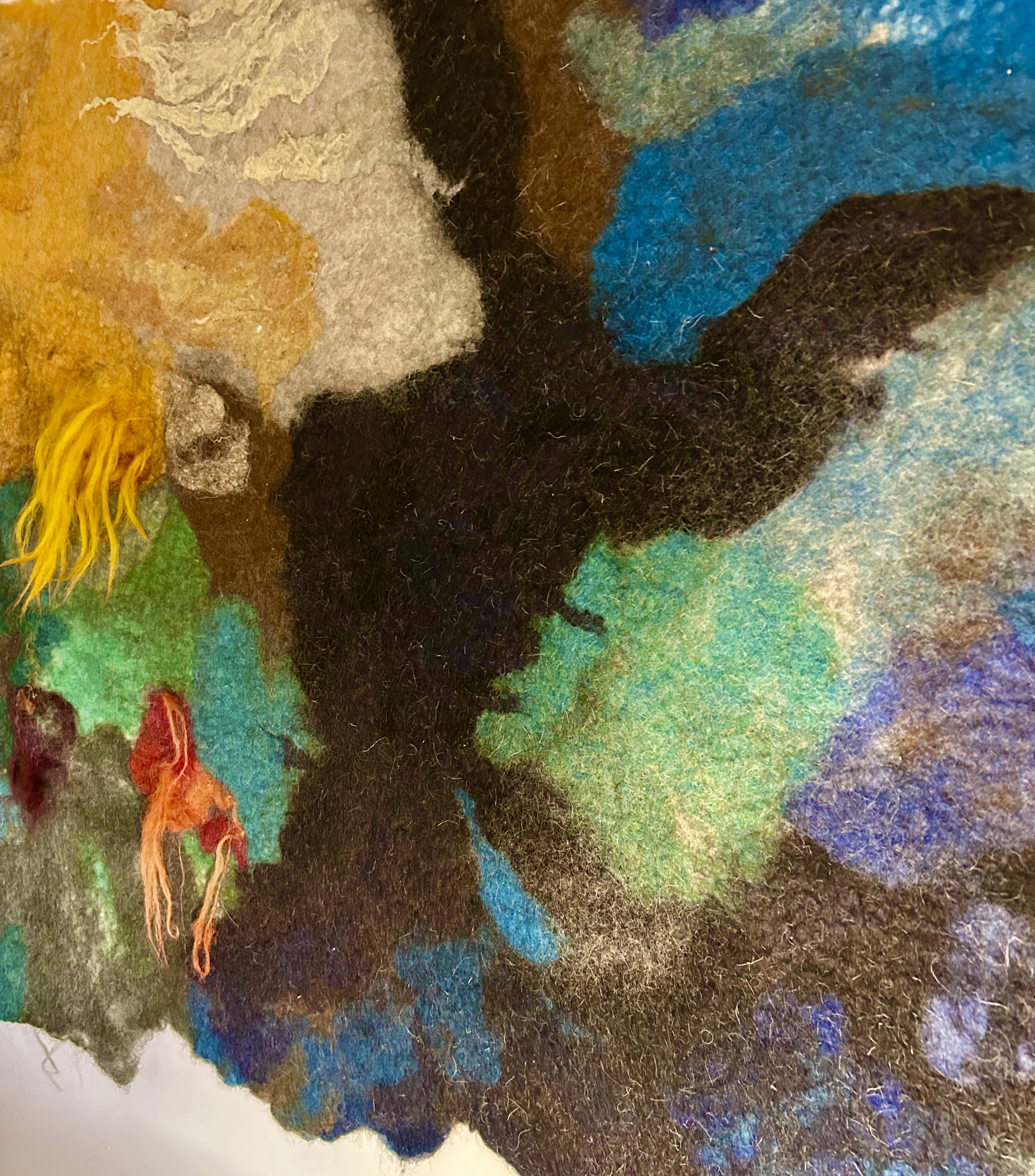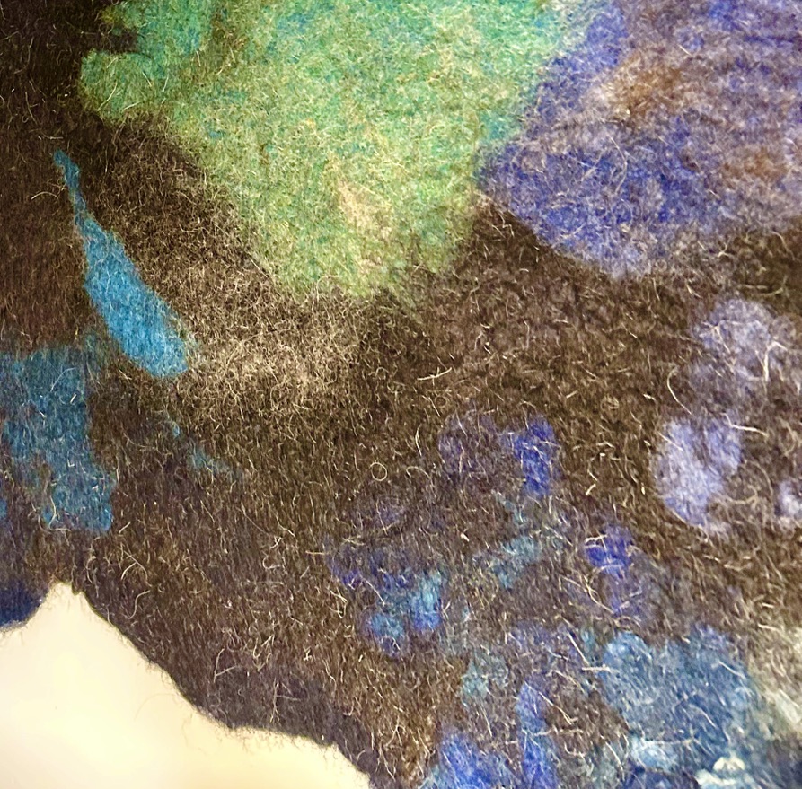 Reed & Paper (90:40 cm) is made of 19 mic Merino wool with reed stems from the woods of the Veluwe where I work. Combined with paper made at the former paper mill De Middelste Molen in Loenen. The bright green color of the reed is still slowly fading away.