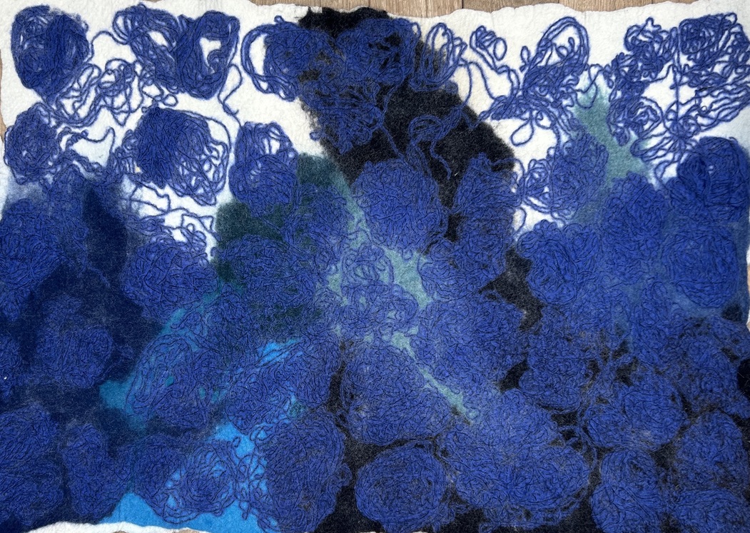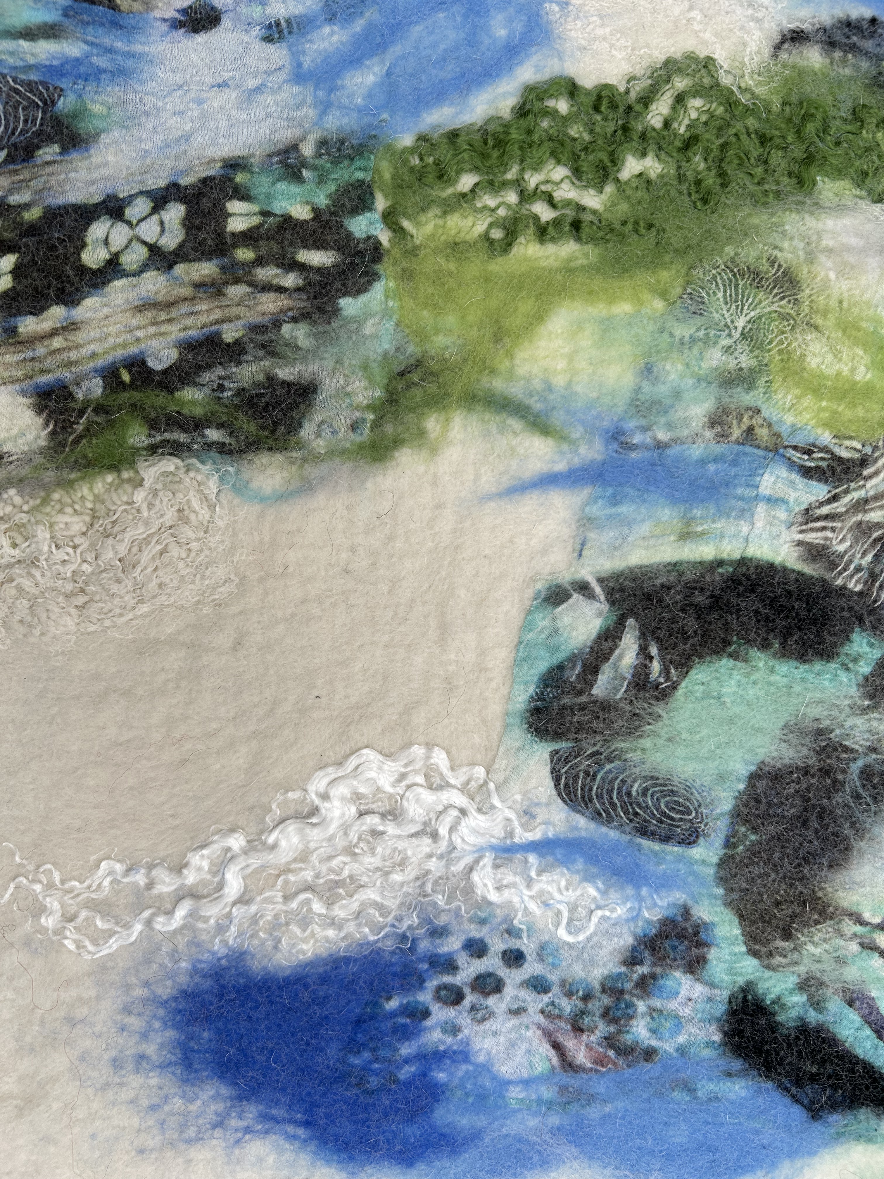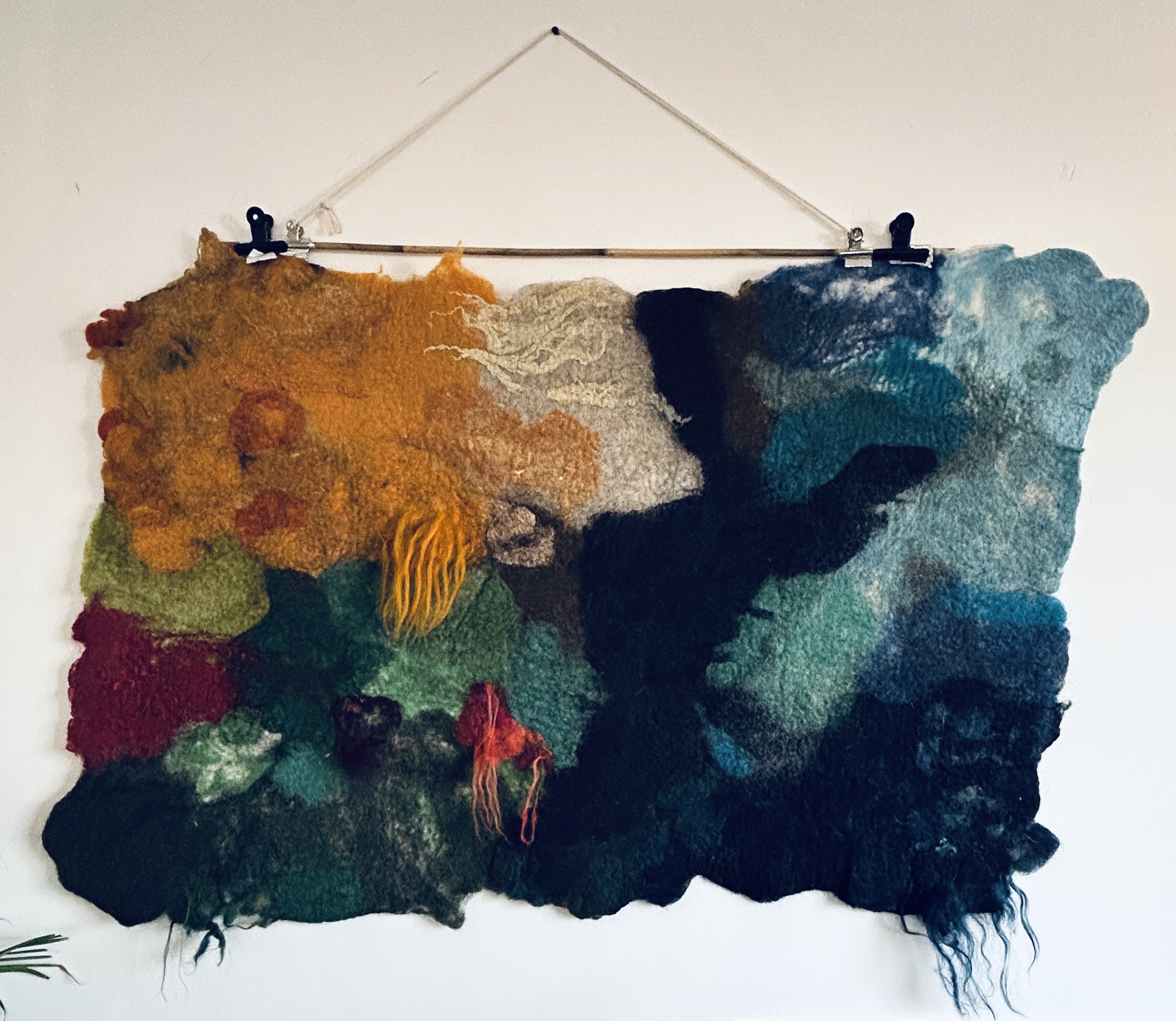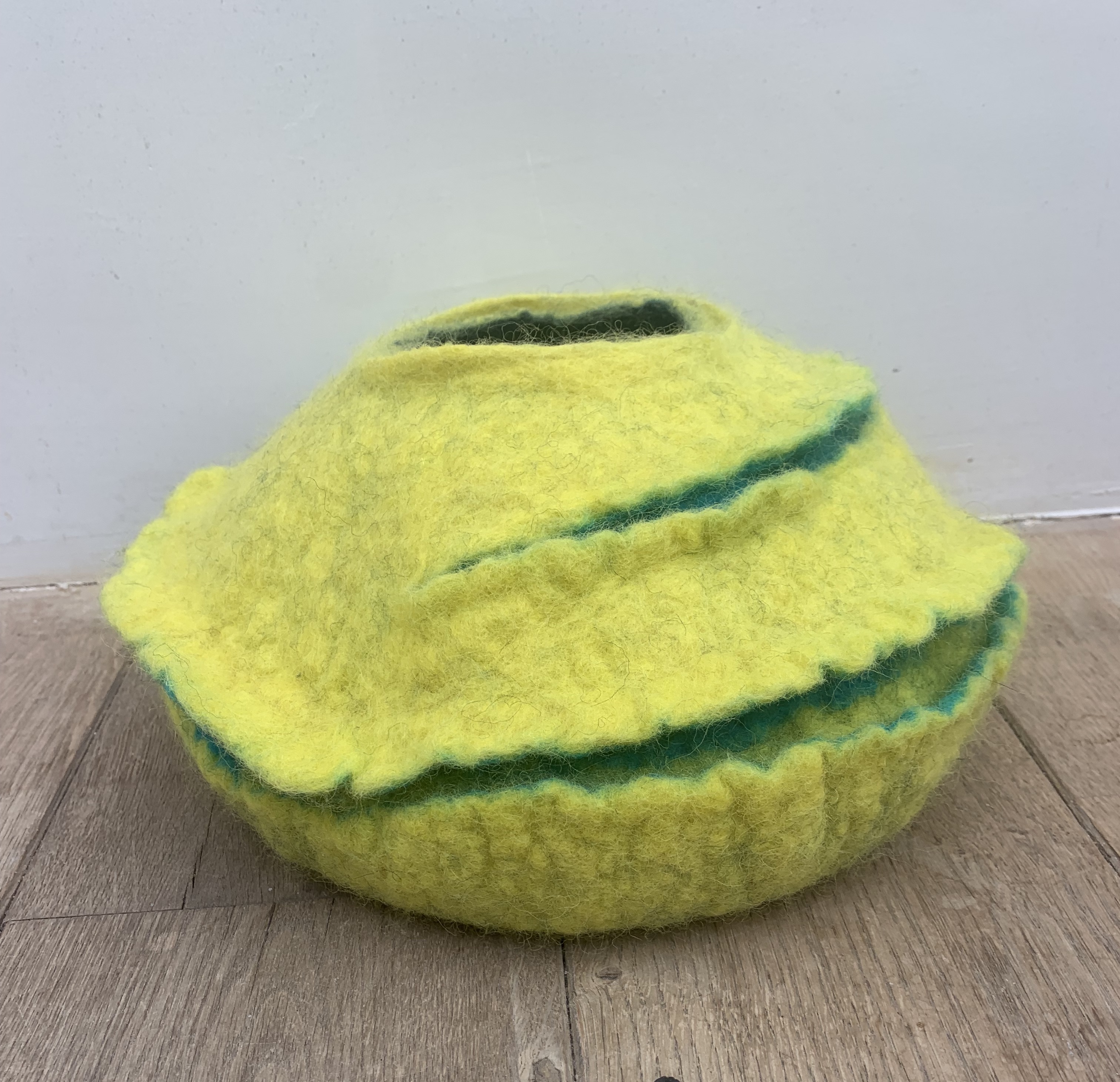 Reed & Paper (90:40 cm) is made of 19 mic Merino wool with reed stems from the woods of the Veluwe where I work. Combined with paper made at the former paper mill De Middelste Molen in Loenen. The bright green color of the reed is still slowly fading away.