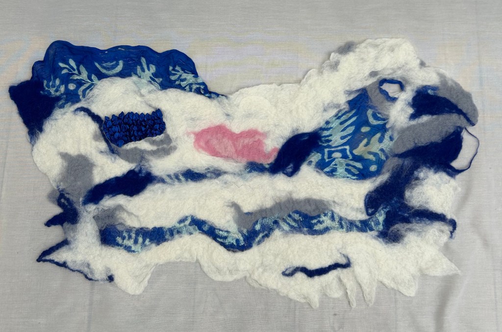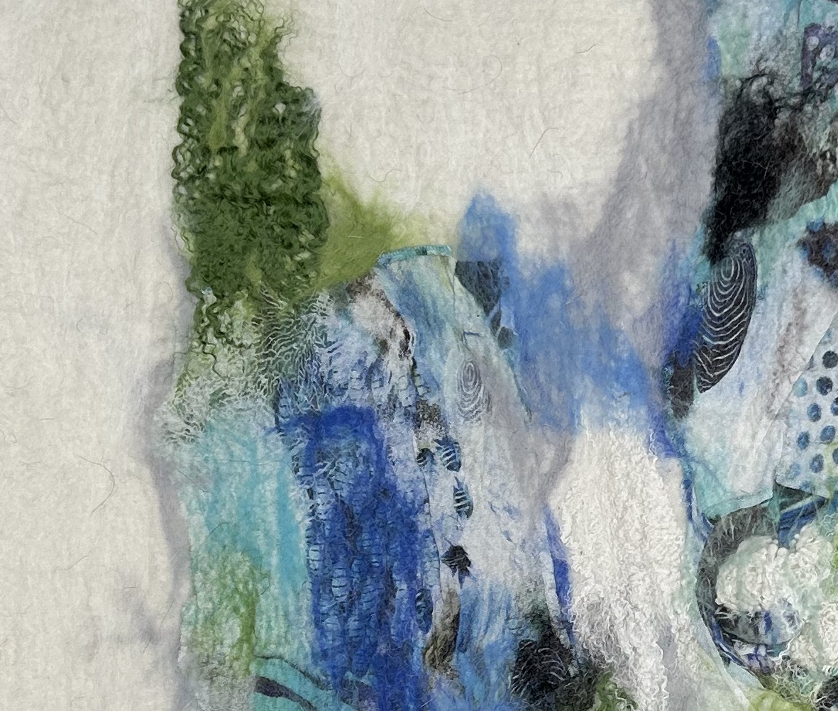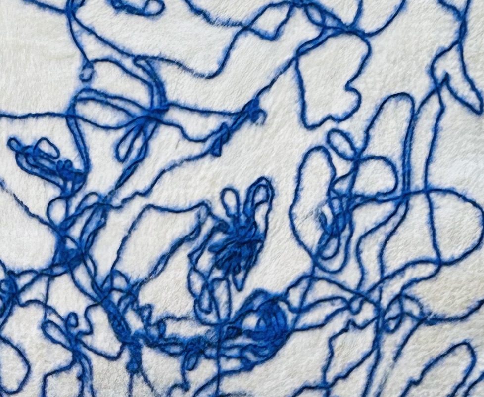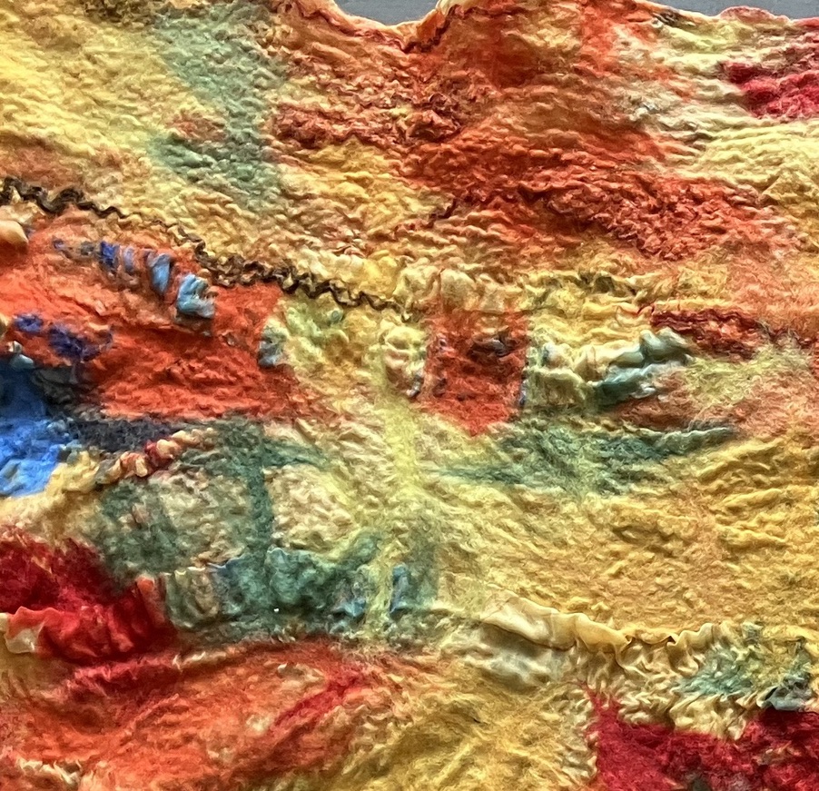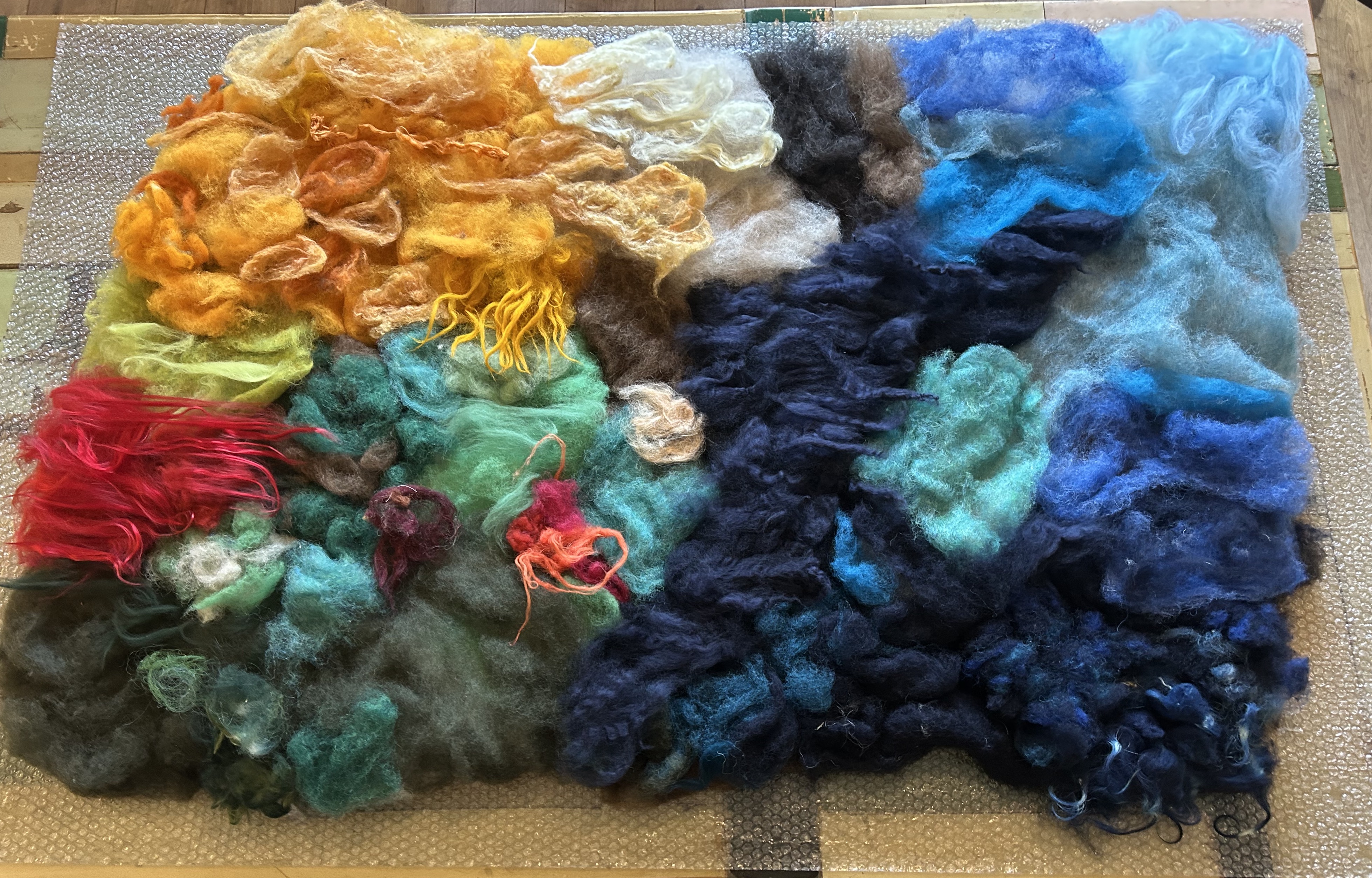 Reed & Paper (90:40 cm) is made of 19 mic Merino wool with reed stems from the woods of the Veluwe where I work. Combined with paper made at the former paper mill De Middelste Molen in Loenen. The bright green color of the reed is still slowly fading away.