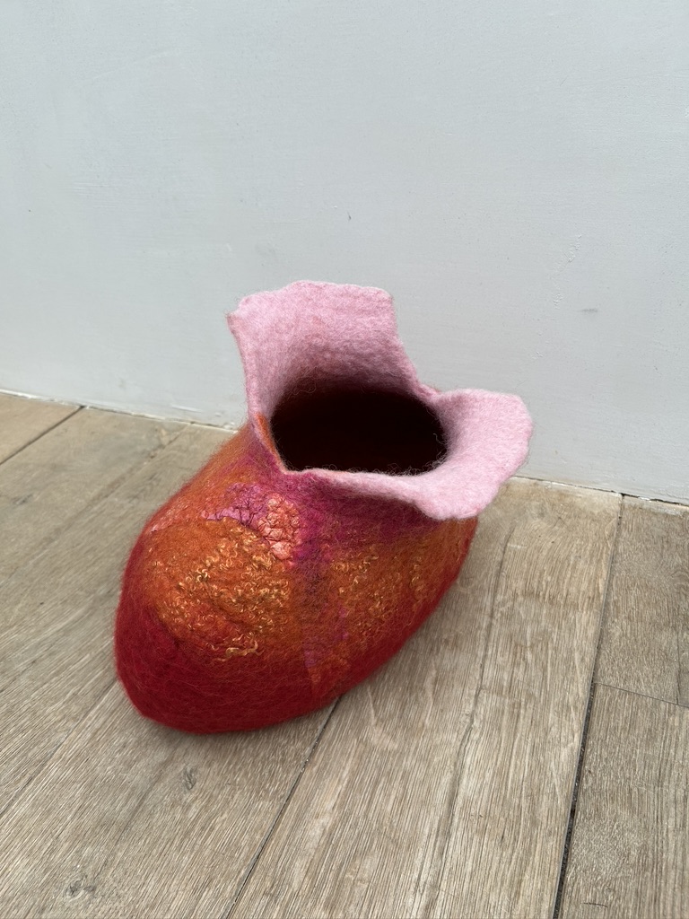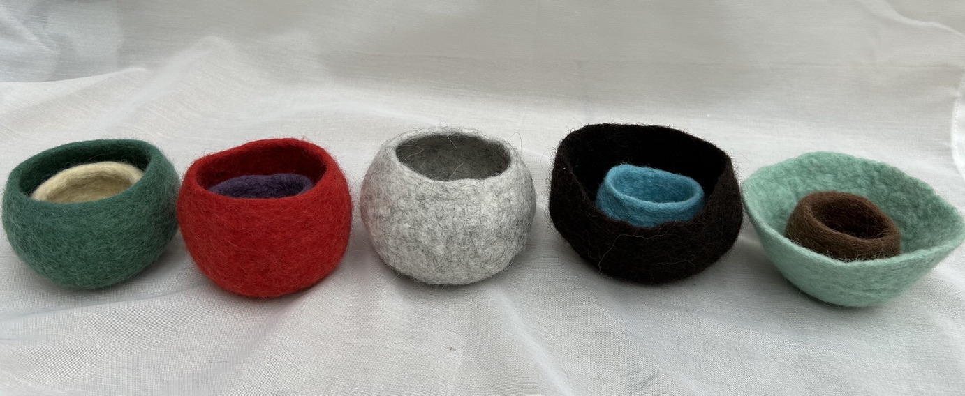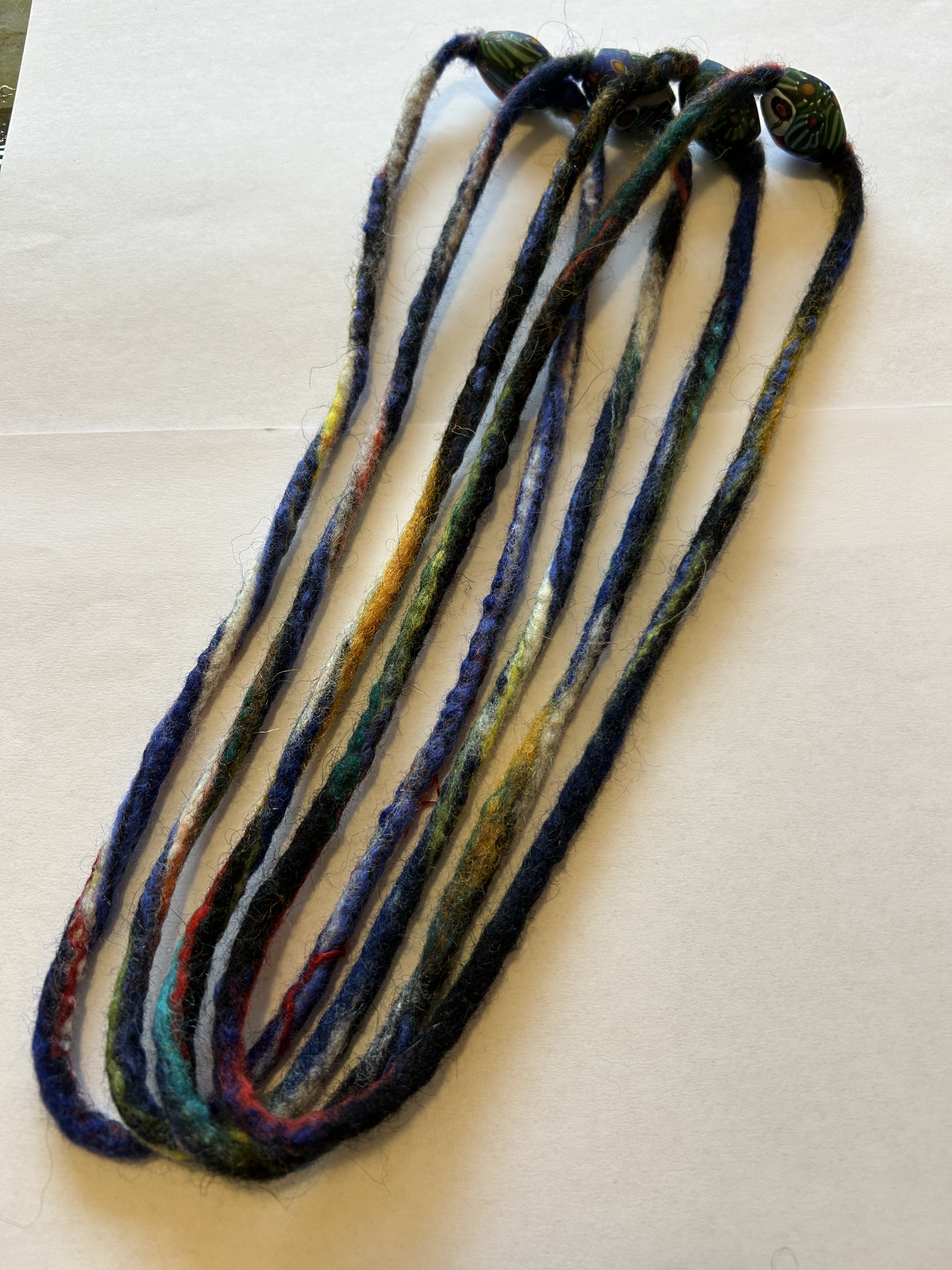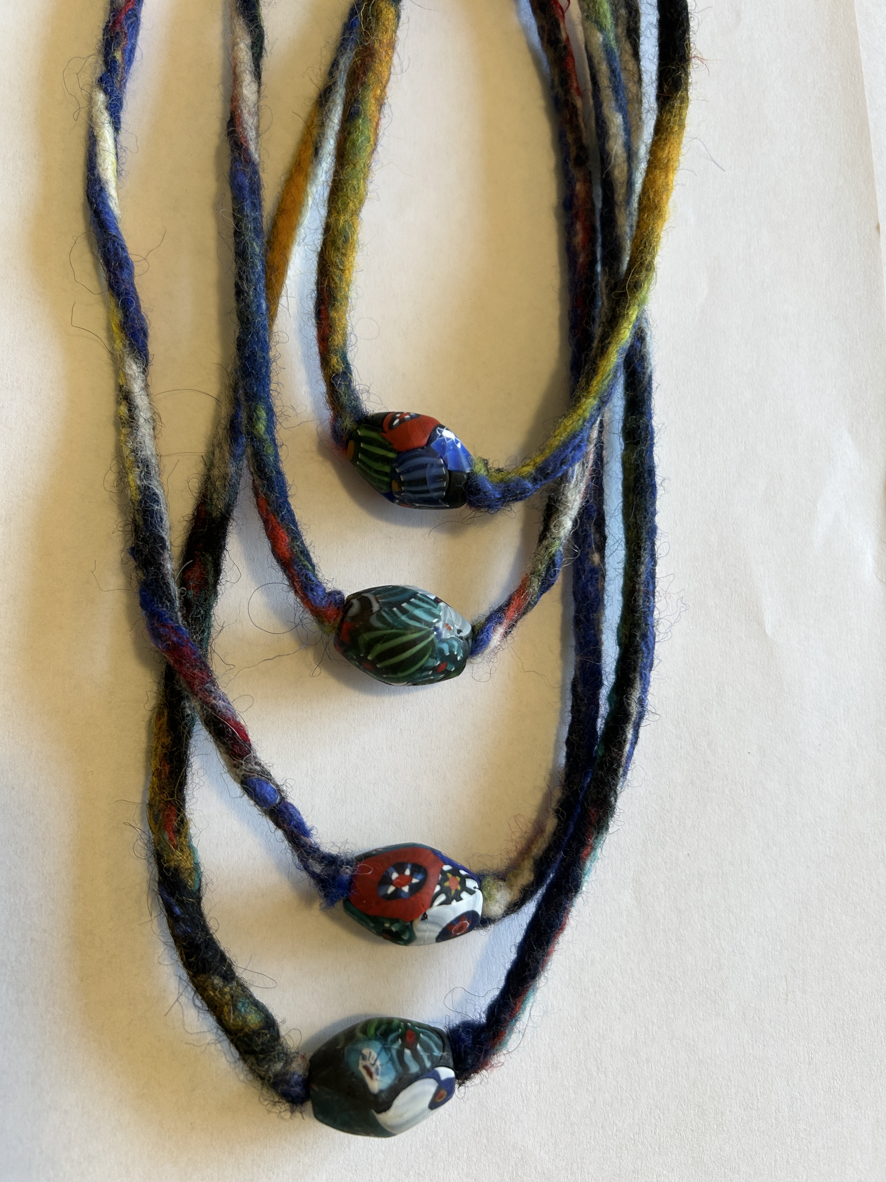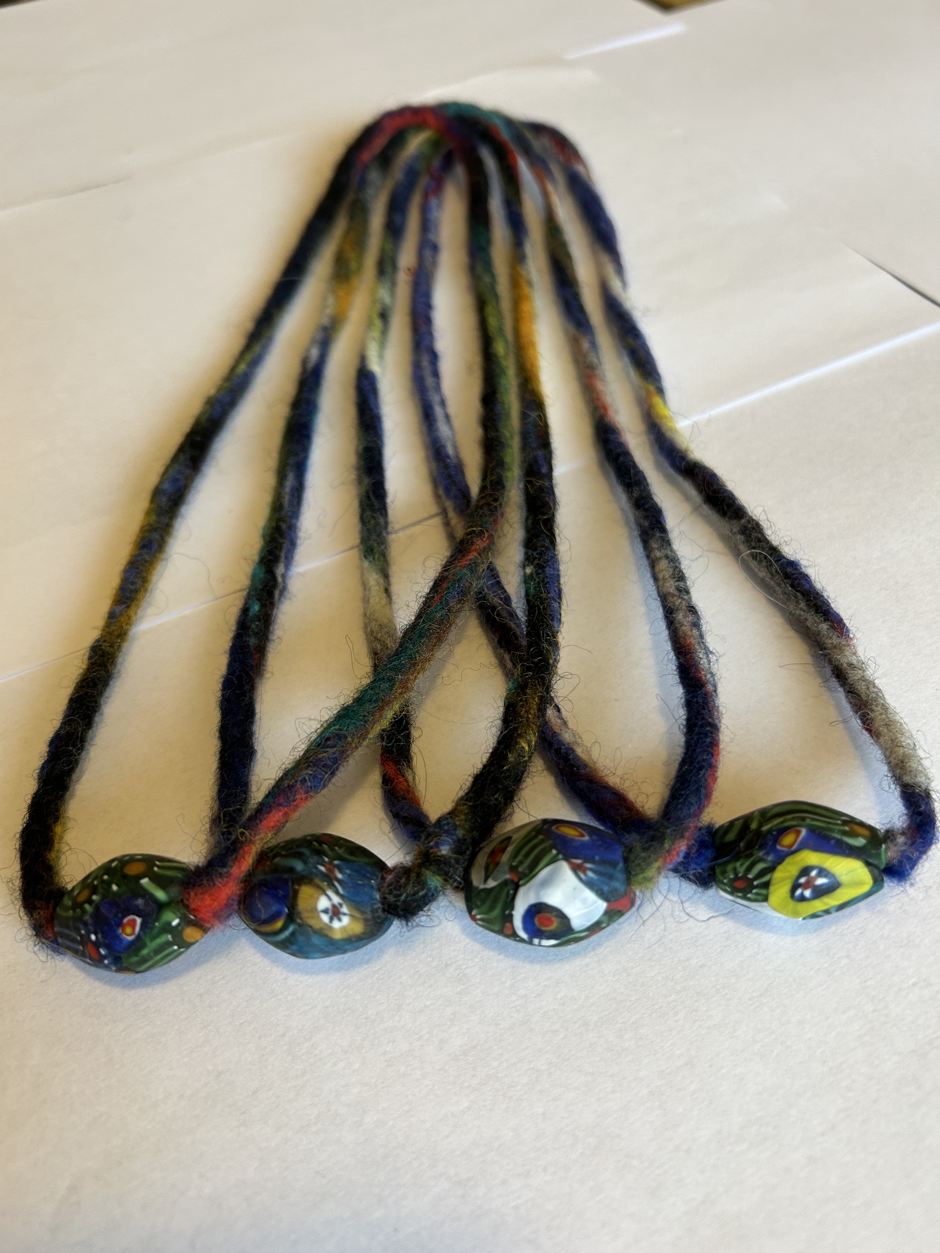 In Accra’s Art Gallery I handpicked five (original) Krobo Beads made of glass and felted five necklaces which symbolize friendship to me: multi colored, many layers, unbreakable as felt is and made with love. Every cord has one color the others doesn’t have and is therefore unique, as friendship is. The fifth cord has all the used colors (and one new one) and will be mine.